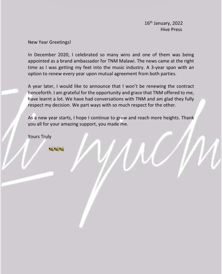 On 18th January Management of Eli Njuchi released a press statement in which they have officially terminated the contract with TNM.