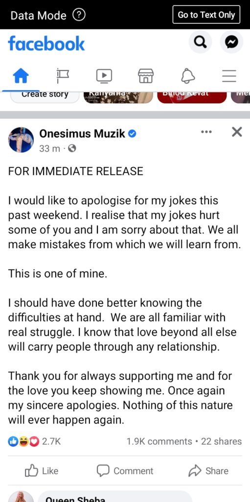 Writing on his Facebook page this morning, Onesimus said he has come to his senses that the joke hurt his fans and that everyone is prone to making mistakes and that we all learn from it.