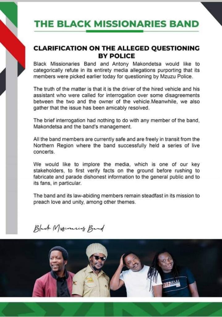The Black Missionaries Band has distanced themselves from social media claims that members of the Band were picked for interrogation by Mzuzu Police.