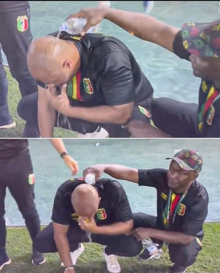 Mali coach Éric Chelle needed cooling with ice cold water after his team lost 2-1 to 9-man Ivory Coast to miss a slot in the semifinals of the AFCON!