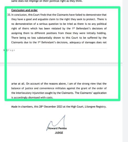 The court’s decision underscored the absence of a compelling case put forth by Nankhumwa, Jeffrey, and Chazama. Justice Pemba’s ruling suggested that their reallocation to different roles within the party didn’t hold sufficient grounds to warrant legal action against the DPP.