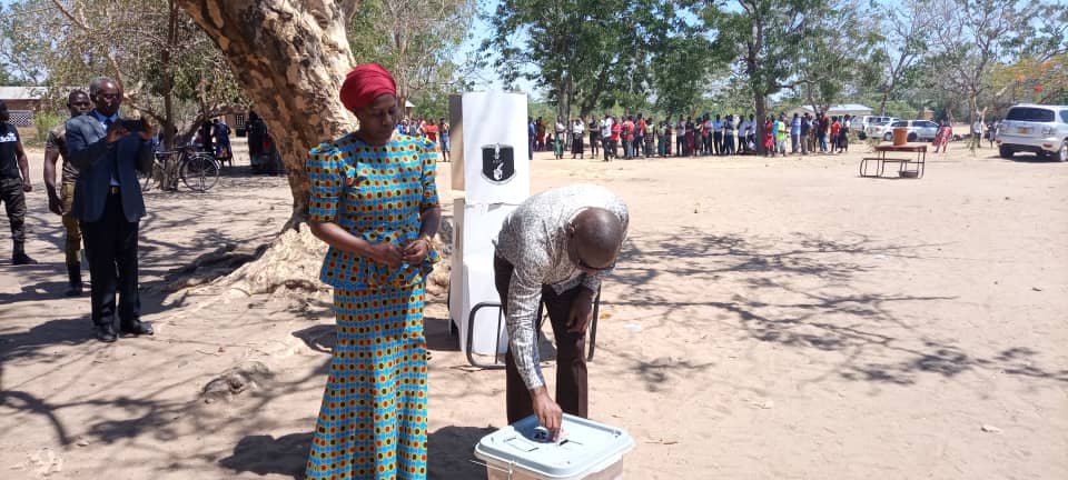 UTM Candidate Frank Mwenifumbo casting his vote at Mwenilondo Polling Centre.He was accompanied by his wife, Kaitano Simwaka nd Vincent Kayuni UTM Councillor for Karonga Central.www.avantmalawi.com