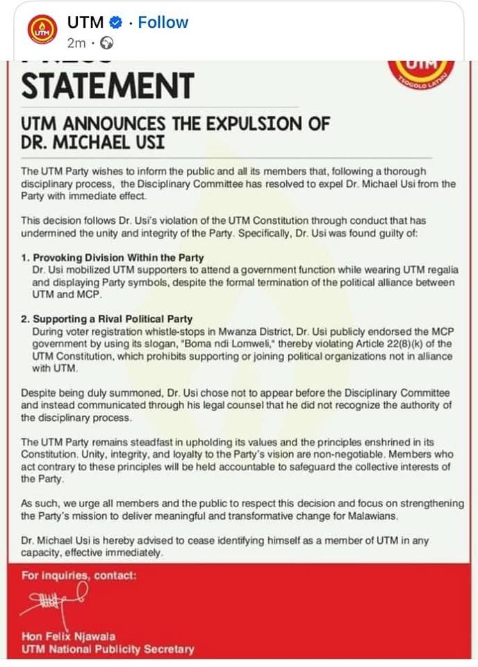 In a statement issued by UTM Publicity Secretary Felix Njawala, the decision was attributed to Usi’s actions, which were deemed to undermine the unity and integrity of the party.